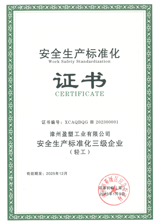 漳州盈塑通過(guò)“安全生產(chǎn)標(biāo)準(zhǔn)化三級(jí)企業(yè)”認(rèn)證