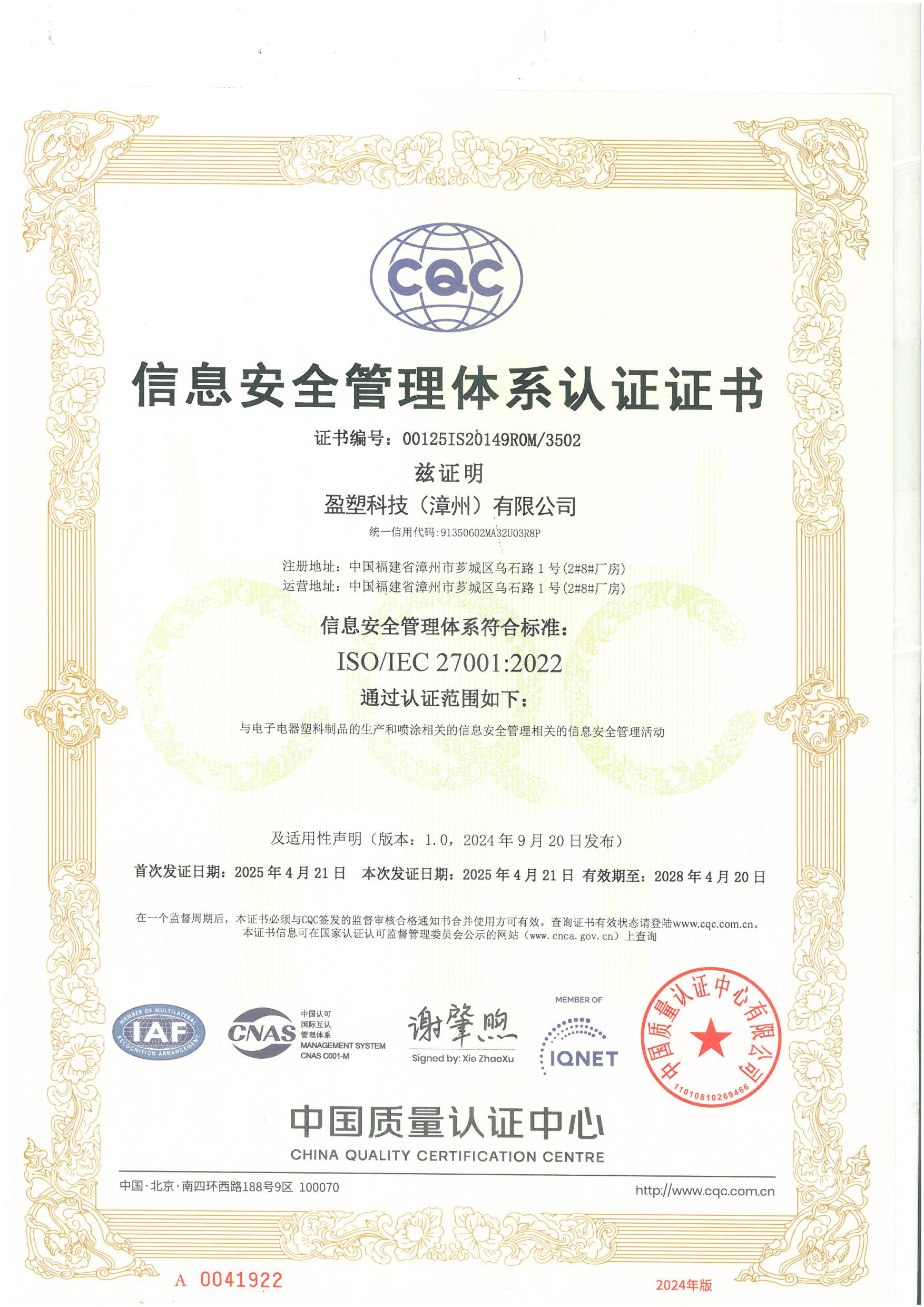 盈塑科技(漳州)有限公司通過(guò)ISO 27001體系認(rèn)證