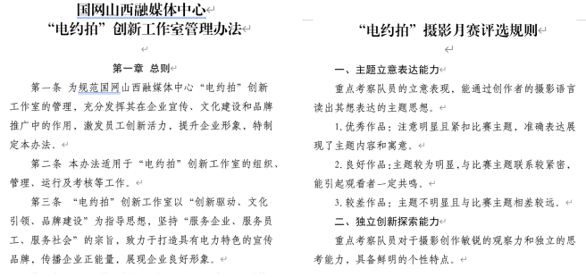 制定《“電約拍”創(chuàng)新工作室管理辦法》《2024年“師帶徒 青藍(lán)計劃”新聞采訪實訓(xùn)方案》《圖片資源管理系統(tǒng)管理辦法》《“電約拍”團(tuán)隊積分獎勵辦法》《爭創(chuàng)“七個最”宣傳成果工作方案》《“為美好生活充電 為美麗中國賦能”攝影月賽評選規(guī)則》《“電約拍”采風(fēng)承諾書》等相關(guān)制度,通過完善的管理機(jī)制和制度,推進(jìn)了項目規(guī)范化運(yùn)營、標(biāo)準(zhǔn)化管理。加強(qiáng)團(tuán)隊文化建設(shè),“電約拍——佳片有約”團(tuán)隊師徒8人,通過附加“葫蘆家族”情愫,打造出“記錄時代、匠心傳承”的團(tuán)隊文化。