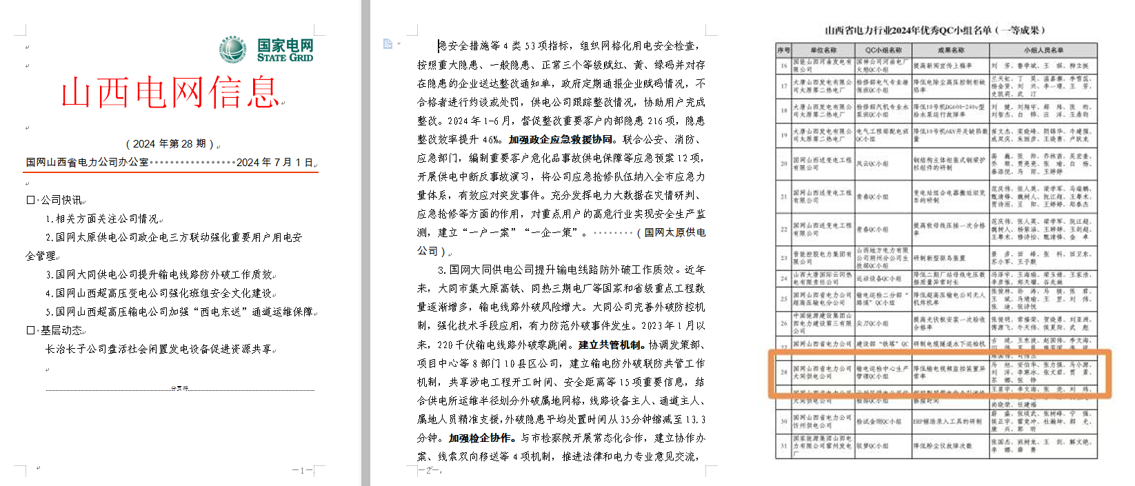 刊登《山西電網(wǎng)信息》2024年第28期,作為山西典型經(jīng)驗(yàn)做法全省宣傳推廣,先進(jìn)技術(shù)編寫課題獲得山西省電力行協(xié)QC成果一等獎(jiǎng)。發(fā)布公司系統(tǒng)網(wǎng)基層動(dòng)態(tài)多篇,內(nèi)網(wǎng)平臺(tái)點(diǎn)擊量合計(jì)破萬(wàn)?!拔辶Α狈劳馄圃谏轿魇?1家地市公司開(kāi)展試點(diǎn),均取得了正向反饋。