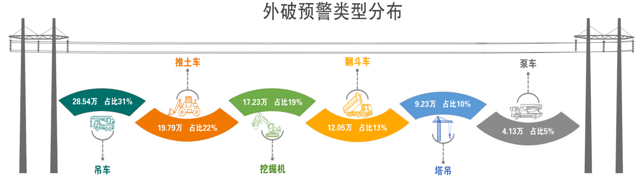 2023年國(guó)網(wǎng)山西省電力公司大同供電公司(以下簡(jiǎn)稱大同公司)發(fā)生輸電線路外破事故5起,大型機(jī)械施工距離不足放電跳閘占比100%,企業(yè)施工點(diǎn)的爆發(fā)式增長(zhǎng)與供電設(shè)施安全之間的矛盾愈發(fā)明顯: